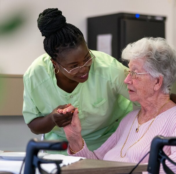 Lächelnde Betreuungskraft in grüner Uniform schiebt Gehhilfe.