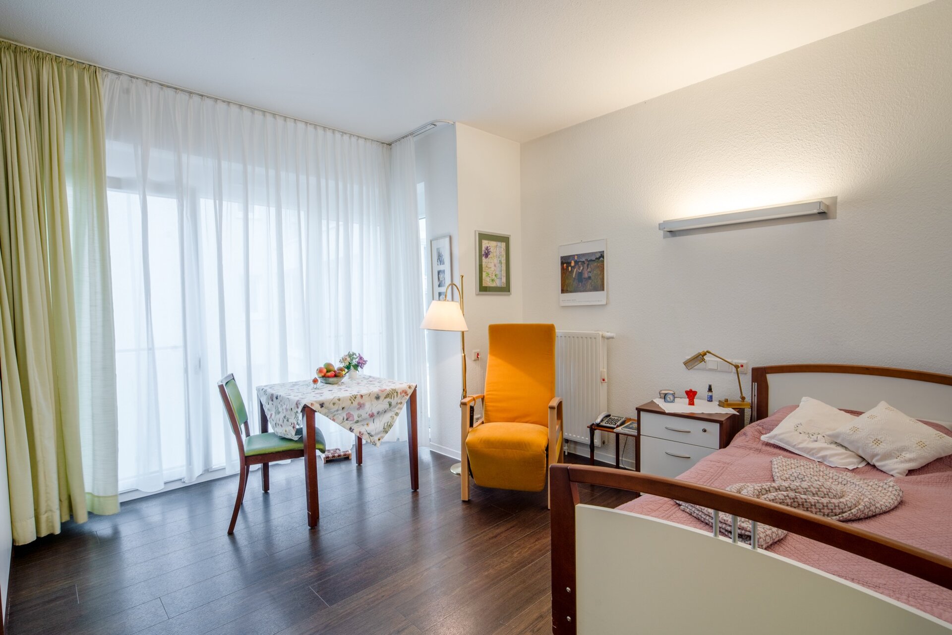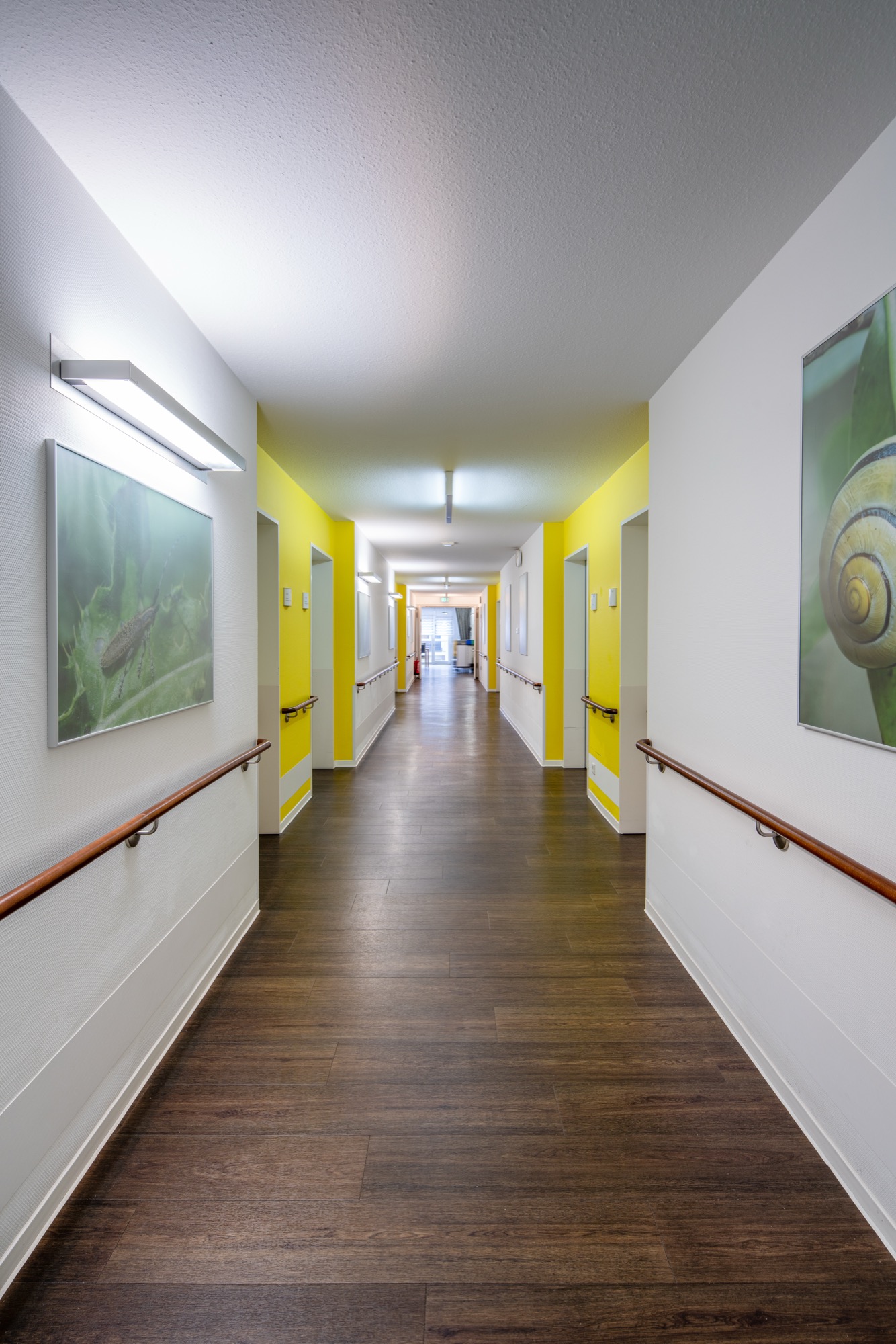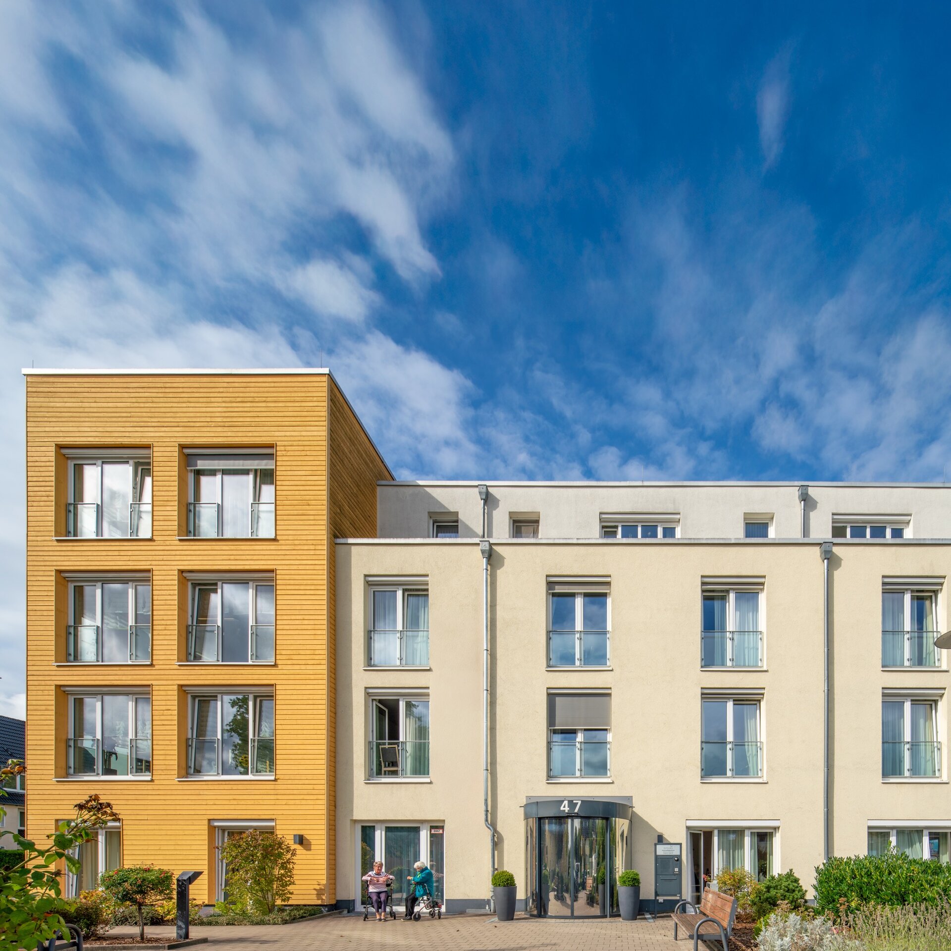Moderne Wohnanlage mit heller Fassade und markantem gelbem Eckgebäude.