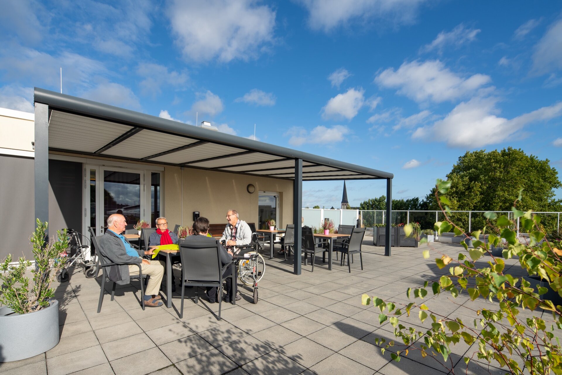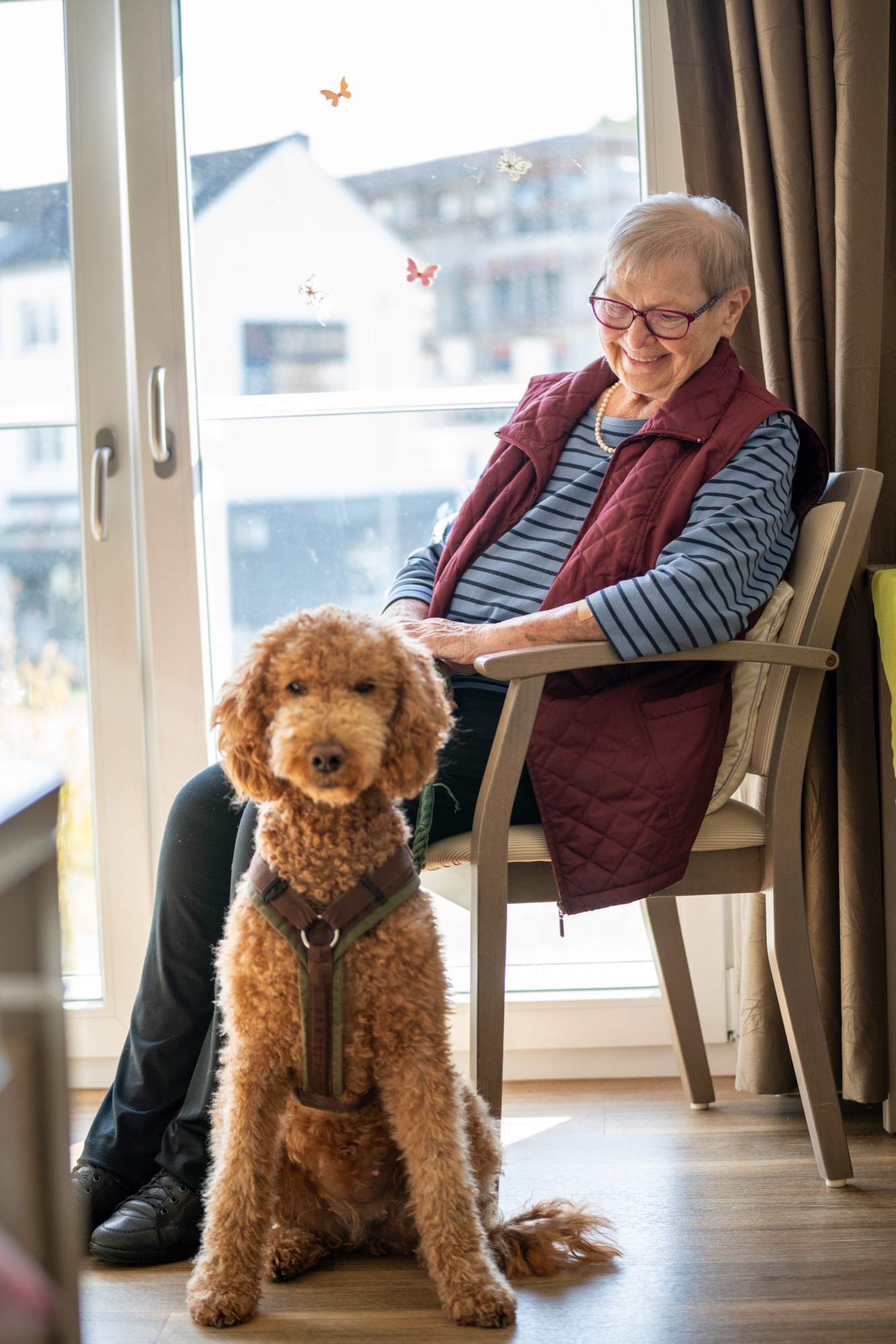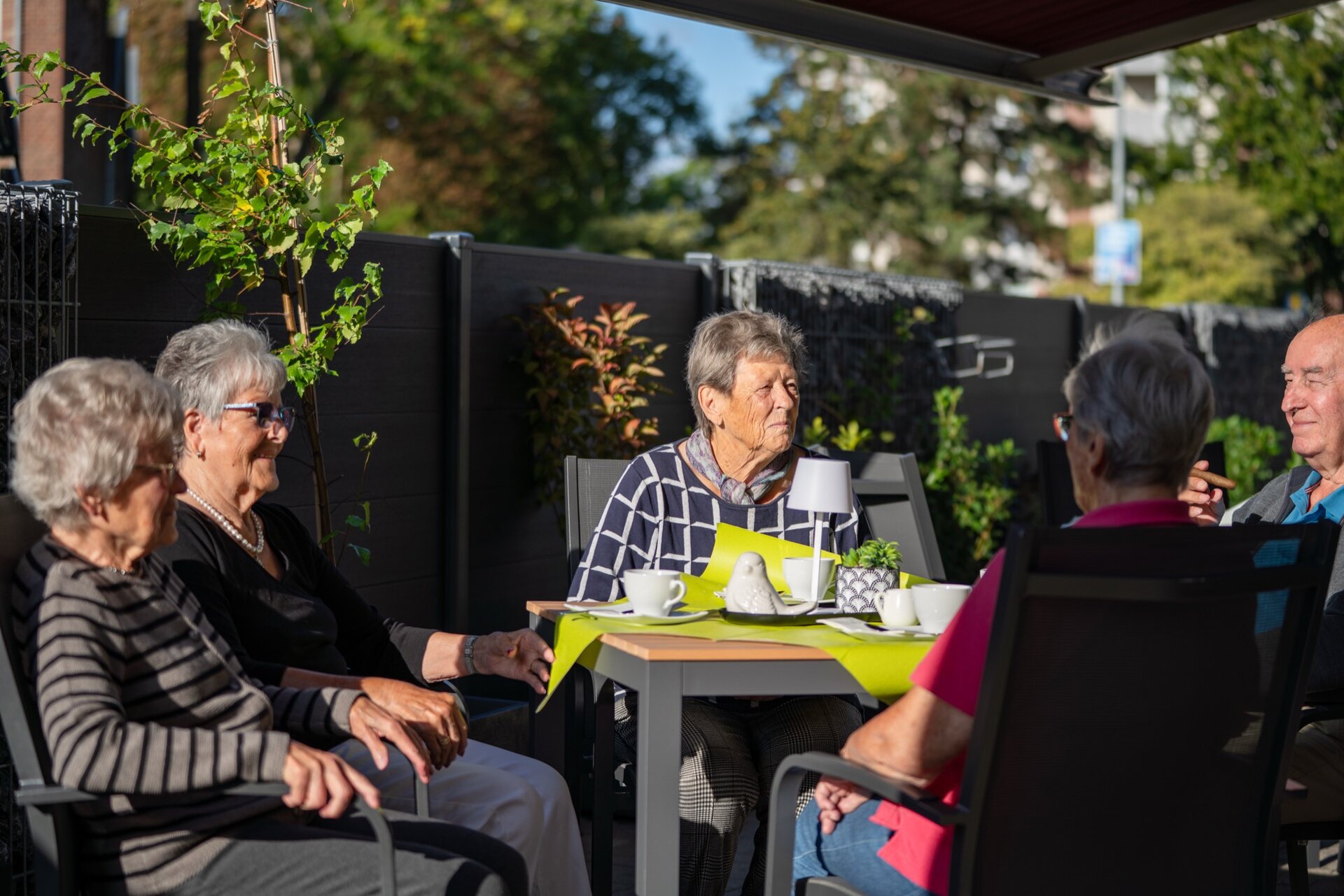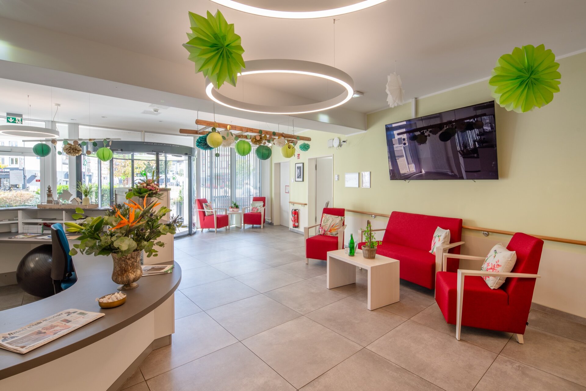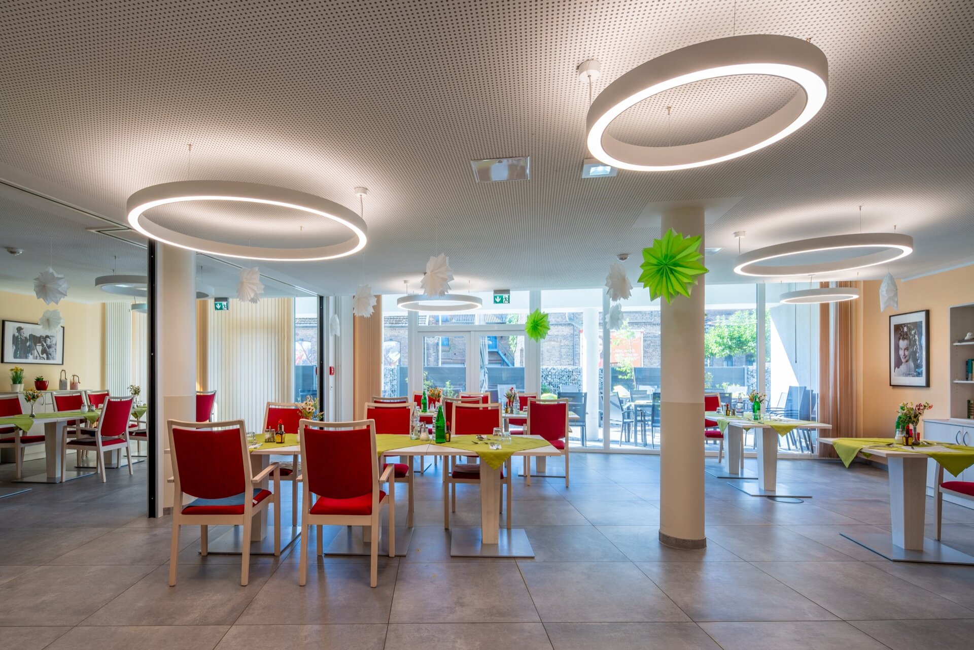 Heller Speisesaal mit Tischen, roten Stühlen und großen Fenstern in einer Wohnanlage.